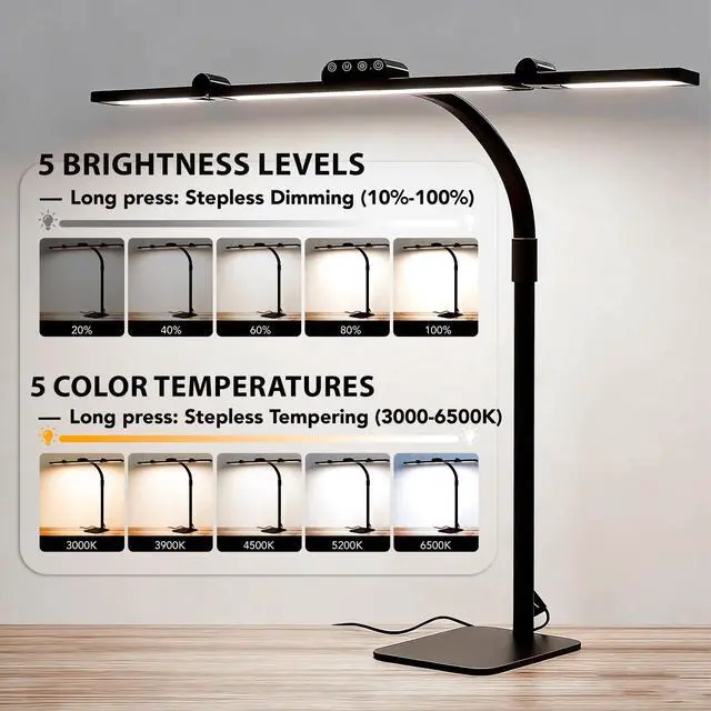 • Flexible Control with 25 Presets: The lamp offers 5 brightness and 5 color temperature levels (25 combinations). For finer adjustment, long-press the buttons for stepless control to find your perfect setting.