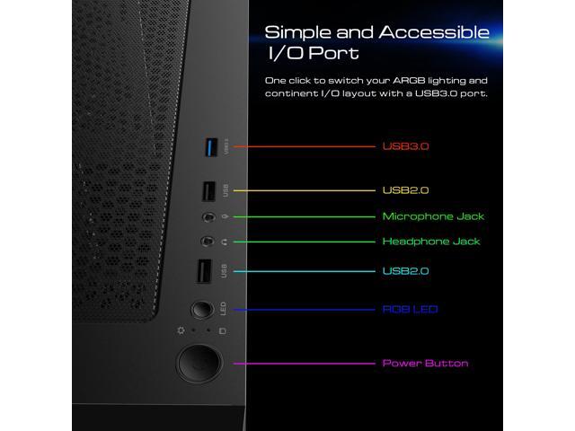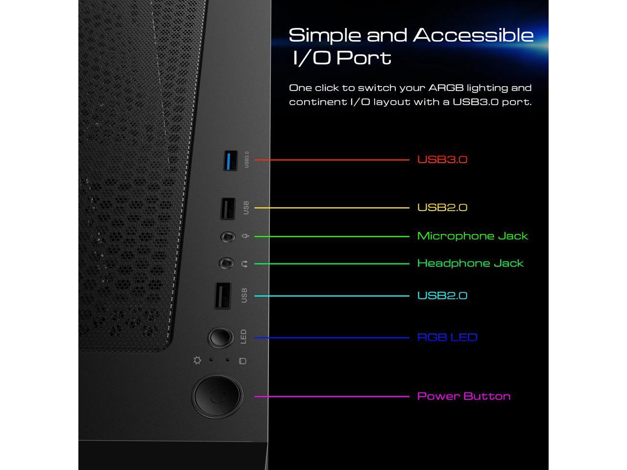 Top I/O Ports: USB 3.0 x1, USB 2.0 x2, HD Audio x1, Fan LED Control x1.