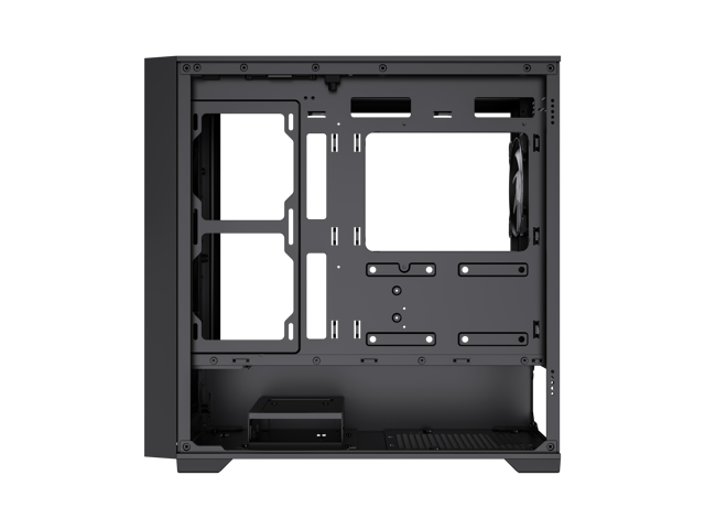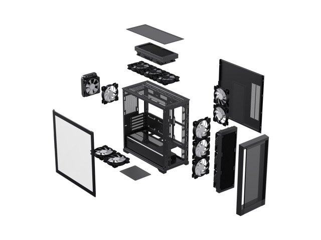- Play through 16 lighting modes via the top I/O panel using the “LED” button. 30 total play-through options include RGB, Breathing, Single Color, and Light Off. Fans are proprietary to this case.