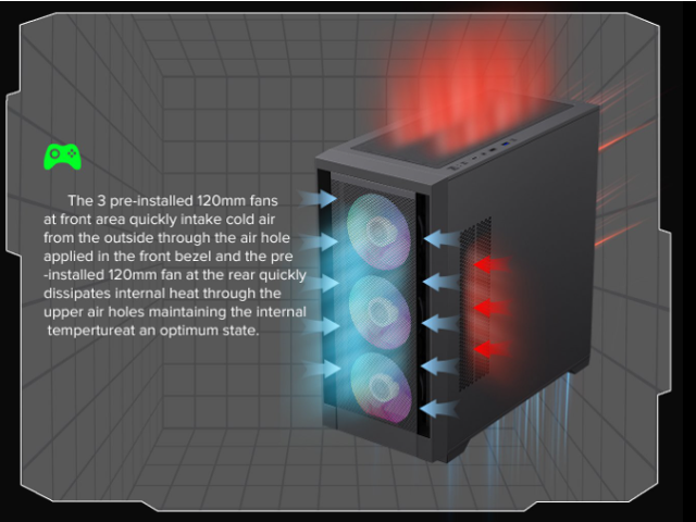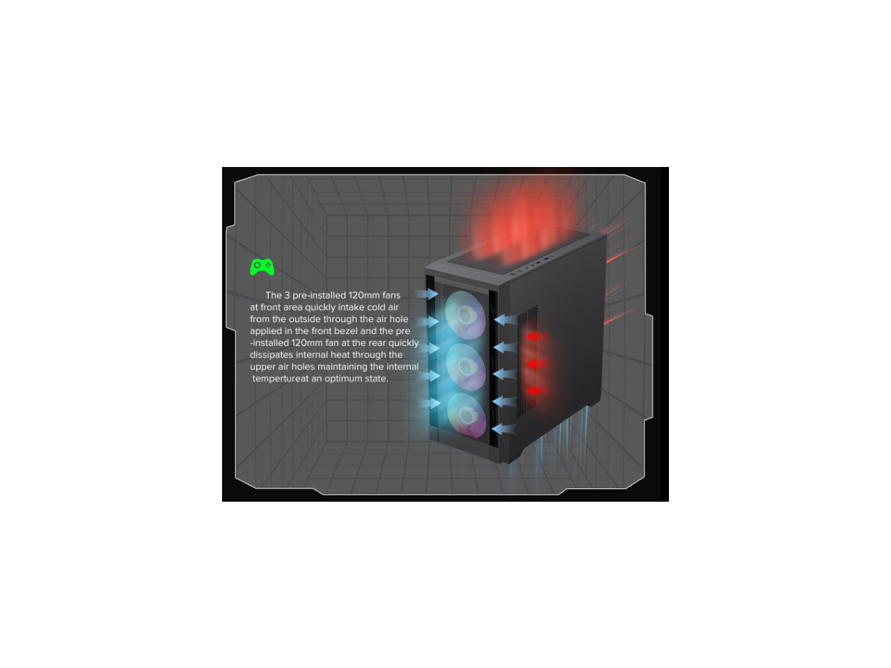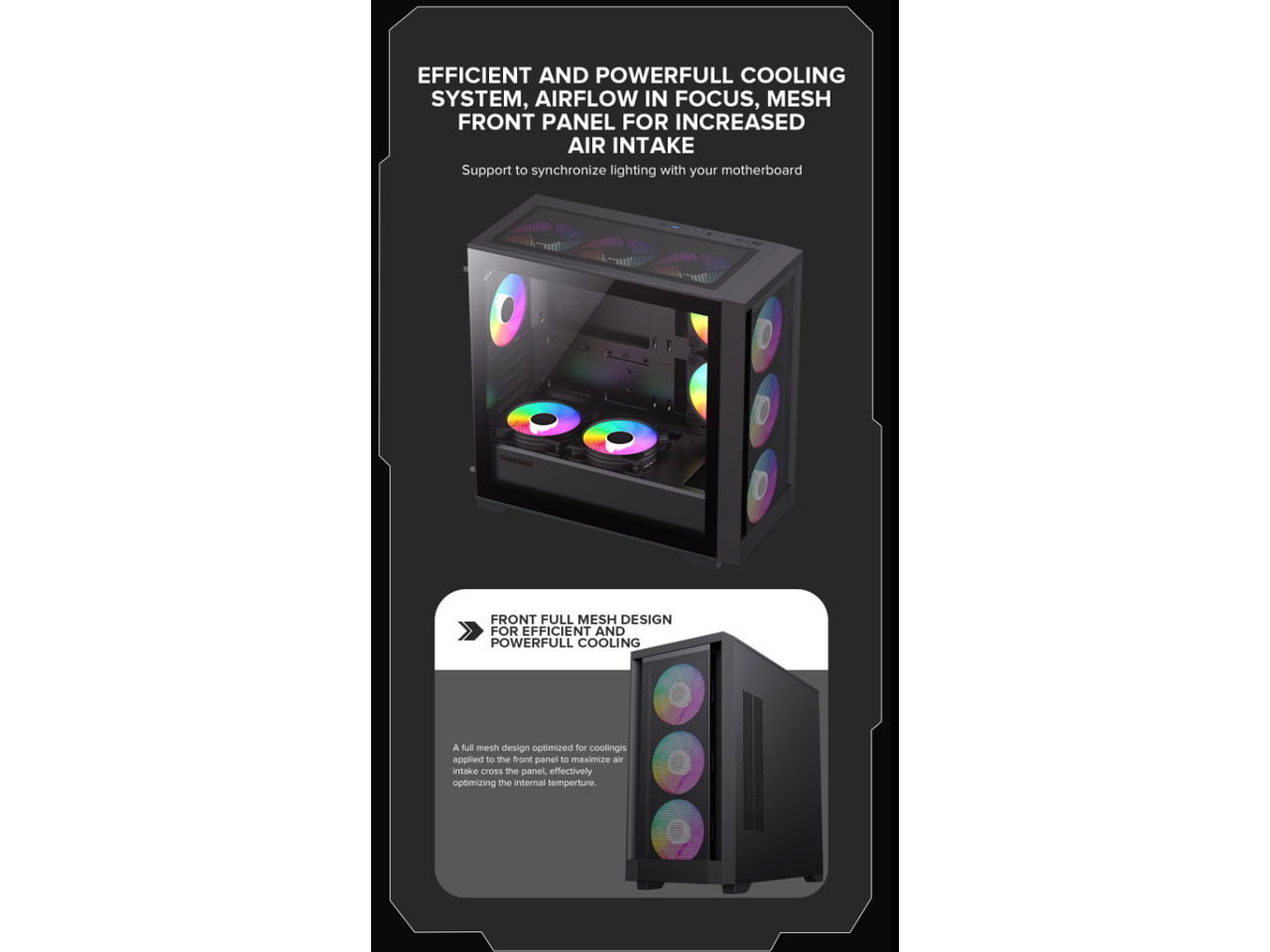 - Extreme Cooling Performance: 3 x ARGB 120mm fans x front, 1x120mm ARGB Fan x rear, keeps temps in control even during high loads.