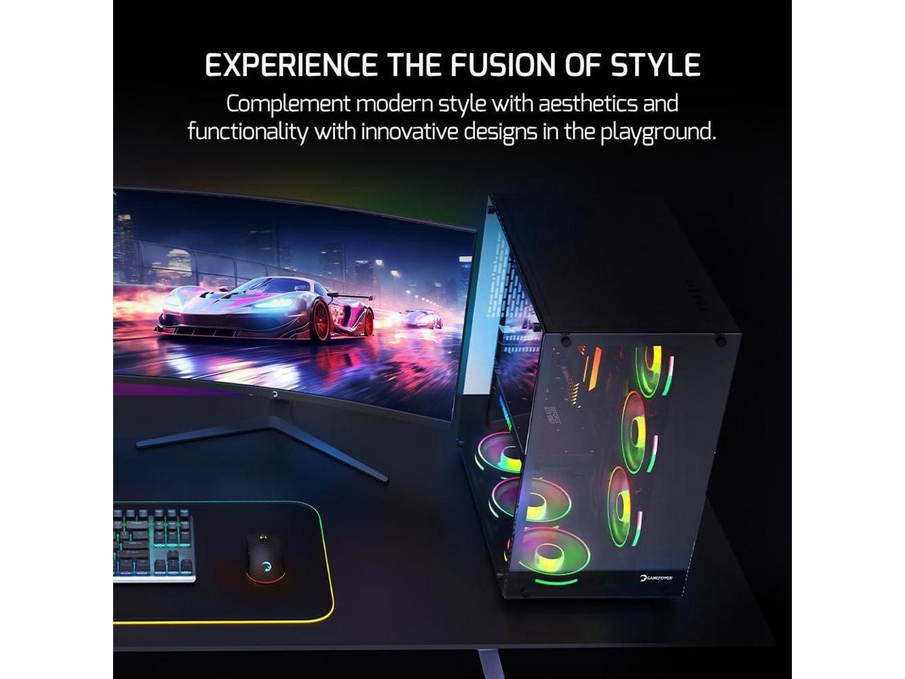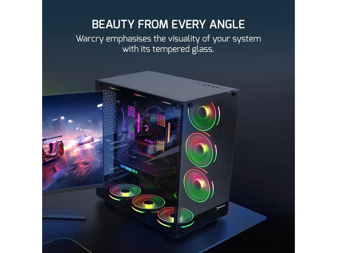 GamePower Warcry ATX Mid-Tower Gaming PC Case with Tempered Glass - Aquarium Style, Includes 6xARGB Fans with HUB, Black