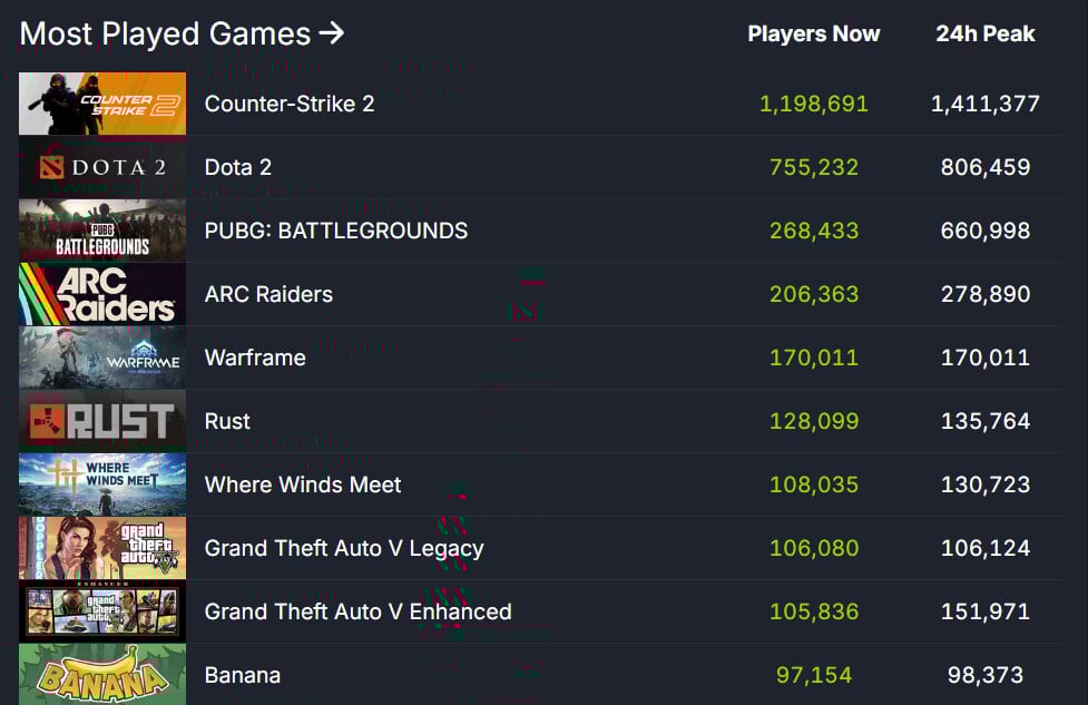Steam’s most-played games continue to highlight just how diverse and ever evolving PC gaming is. Titles like Counter-Strike 2 and Dota 2 remain firmly planted at the top of the charts, drawing in hundreds of thousands of concurrent players every single day. Their combination of competitive depth, frequent updates, and massive esports communities keeps them consistently dominant. Meanwhile, PUBG: Battlegrounds continues to hold one of the highest all-time peak records on Steam, proving that the battle royale craze it helped ignite still commands tremendous interest.