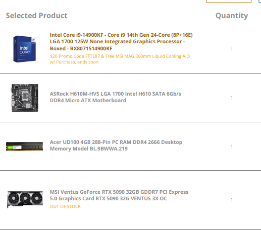 That CPU will have trouble with a 5090 bottlenecking at lower resolutions also the motherboard wont have the full PCIE lane support for that card the ram you chosen is 4GB barely enough to run windows 10/11 and it’s a very slow speed.