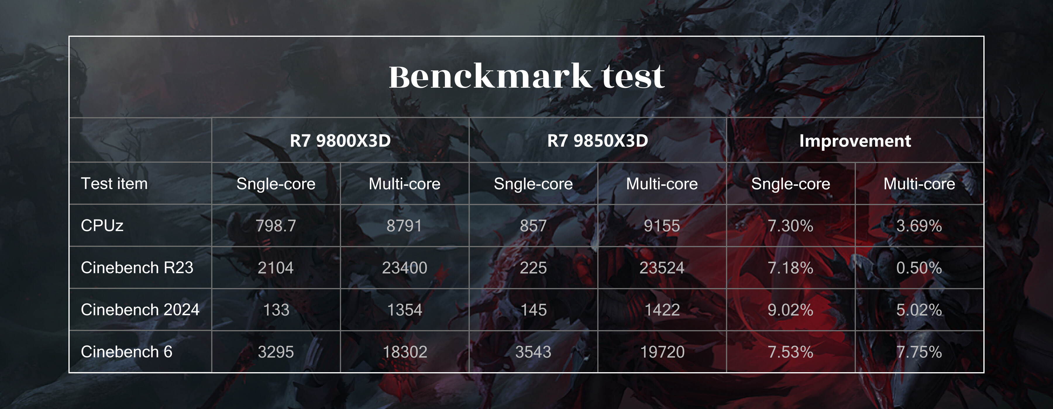 The 9850X3D looks like a refinement, not a redesign. Expect slightly cleaner boost/scheduling behavior, a bit better frame-time stability and 1% lows, and marginal single-core FPS uplift — not a big IPC jump.