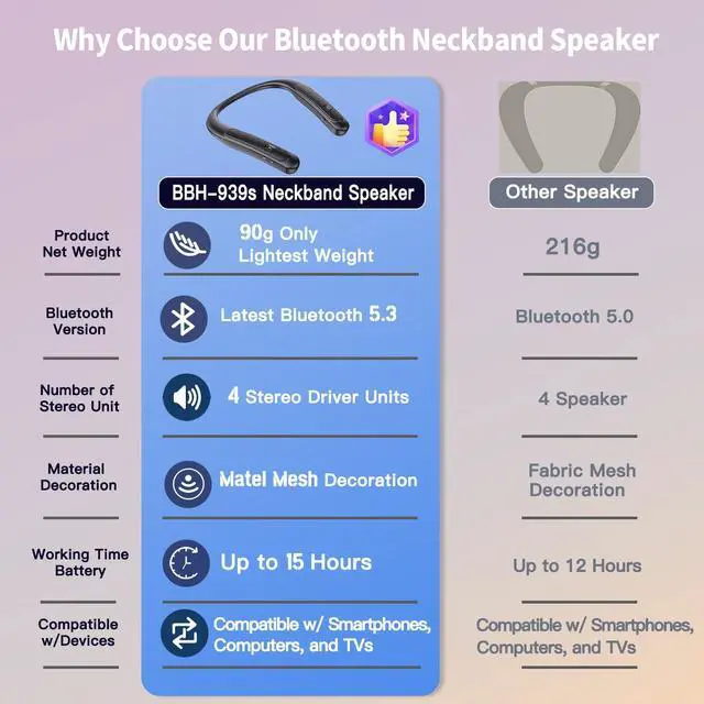 2025 New Release Neckband Speaker w/ Latest Bluetooth 5.3 Technology The new upgrated speaker adopts the latest bluetooth 5.3 technology, consuming less power than bluetooth 5.0 while achieving a more stable connection and faster communication, no signal loss or music interruption. With multi-point support, connect two devices simultaneously. Transmission is stable up to 33 feet (10 meters), and it's compatible with all bluetooth-enabled devicesdelivering lossless HD sound.