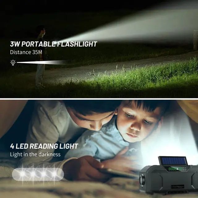 EMERGENCY LIGHT:if you are in an emergency situation,this portable emergency radio can provide a 3 W flashlight with a distance of more than 25 MThe foldable reading light is also convenient for reading in dark conditionsSOS alert can reach 200 M