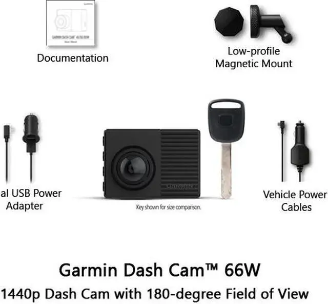 Garmin Dash Cam 66W Brand New Includes One Year Warranty Product # 010-02231-05 The Garmin Dash Cam 65W is a Car key-sized high-definition driving video recorder which automatically records and saves footage of incidents. The camera has a 180-degree wide-angle lens that captures crisp 1440p footage, including cross traffic, detailed time and GPS location data. It has Garmin Clarity&trade HDR which provides increased detail in low light situation. The cam has a Built-in Bluetooth® technology & Wi-Fi® connectivity that allows user to wirelessly view, edit and share, saved footage to your compatible smartphone running on the Garmin Drive™ application.
