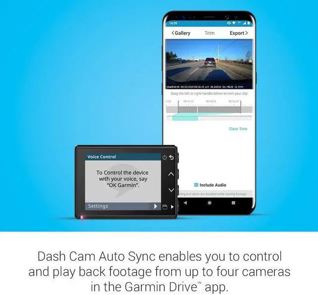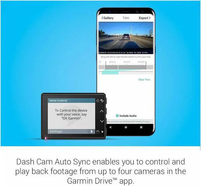 The Cam provide notifications for nearby red light cameras and speed cameras and also has driver alerts which includes forward collision, lane departure warnings and? Go? alerts to enhance driver awareness encouraging safer driving. The Garmin Dash Cam 65WAuto Sync enables you to control and play back footage from up to four cameras in the Garmin Drive app. It features Parking mode that monitors your car? s surroundings while your car is parked, and the engine is not running. It automatically begins recording if motion is detected. The Dash cam 65W have Voice Control which allows you to easily save as audio or the Travelapse&trade video capture feature.