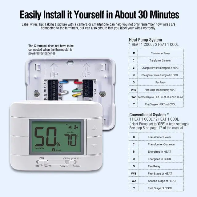 Garystat G721 heat pump thermostat has a large, easy to read backlight display, that allows you to clearly see what you’re doing for easier operation, very suitable for middle-aged and elderly people to use. Plus, this upgraded thermostat features a real-time temperature and humidity cycle display.