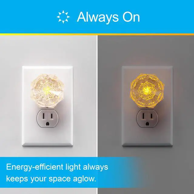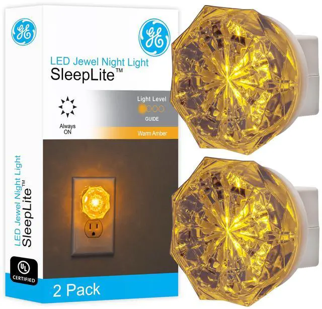 Brighten up your home with the GE Jewel LED Night Light. The stylish, sparkled jewel design houses an energy-efficient LED that saves you money year after year. The night light produces a high-quality amber glow great for illuminating your nighttime routine each evening. Featuring an entirely unique design that truly enhances your established decor, it will fit in perfectly within bedrooms, staircases, hallways, bathrooms and much more. There will never be a need to manually turn on the night light once you plug it into your outlet of choice, the warm amber glow will continually illuminate the room day after day, or until unplugged. However, the night light remains extremely energy efficient. You can also position the night light to conceal your entire outlet, or free up your second outlet by using only the top receptacle. Transition your home from day to night in high-class style with the GE Jewel LED Night Light.