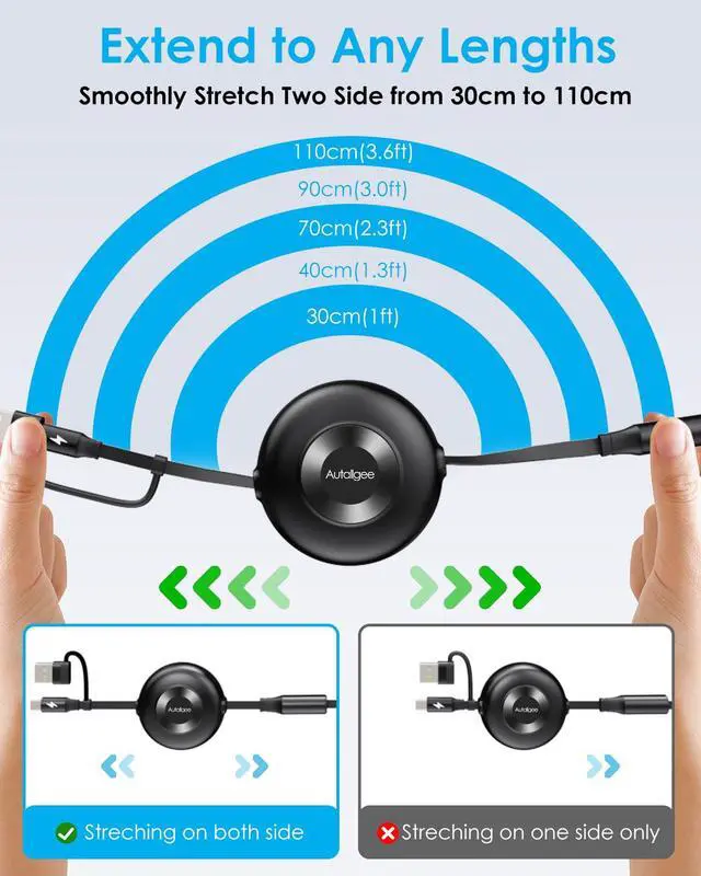 Ultra-Portable & Adjustable Length: Extends up to 110cm (3.6ft) and retracts for compact storage,eliminating tangles.The retractable cord that is close in size to airpods can be easily stowed in a handbag, laptop bag or pocket.(Note: Please do not pull just one side which is a wrong operation and it will get jammed.)