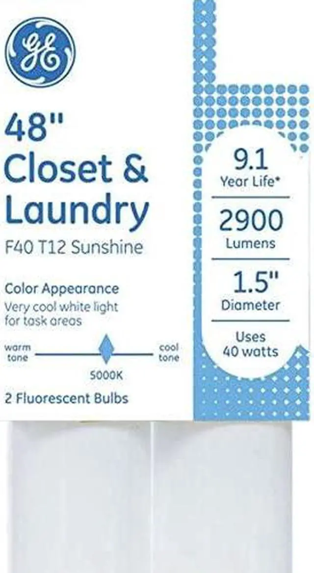 GE?s KEY_TAB 40 watt T12 closet and laundry sunshine fluorescent bulbs provide cool, KEY_TAB bluish-white light that is great for task areas. These bulbs are rated KEY_TAB to last 9 years based on 6 hour per day consumer use. Use these 48 In. KEY_TAB long fluorescent bulbs with a 1-1/2 In. diameter in laundry rooms KEY_TAB closets and commercial applications like specialty retail and print KEY_TAB shops.