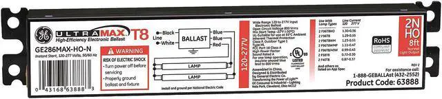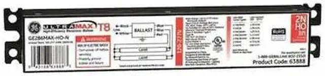 ProLine (TM), Electronic, Fluorescent Ballast, Ballast Start Type Instant, Input Voltage 120 to 277V AC, Number of Bulbs Supported 1, 2, Max. Bulb Watts 38 W, 44 W, 59 W, Ballast Bulb Type T8, Dimming No, Dimming Type No Dimming, Dimming Method No Dimming, Dimming Range No Dimming, CA Title 20 Compliant No, Min. Starting Temp. -22 Degrees F. This item has been restricted from sale in the following state (s): []