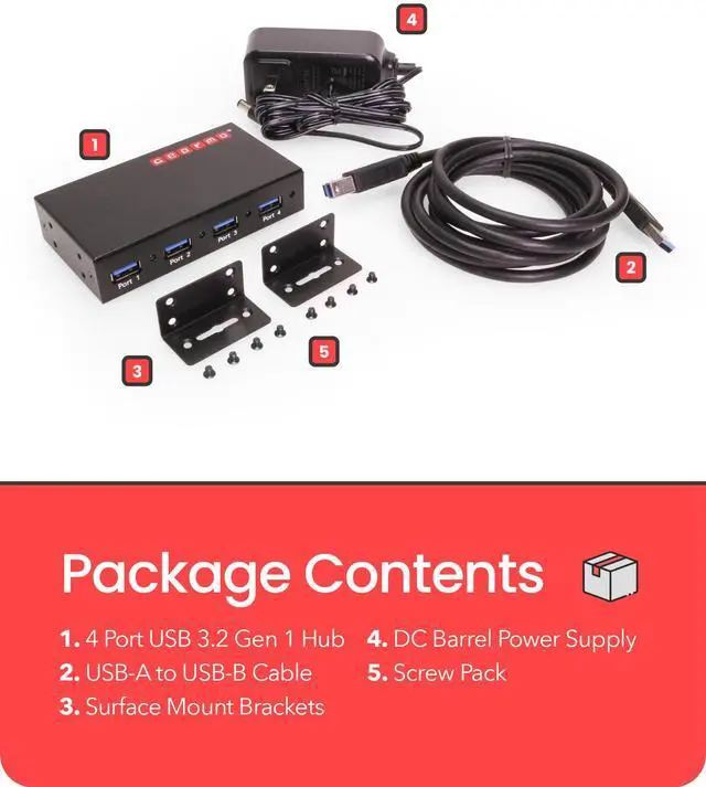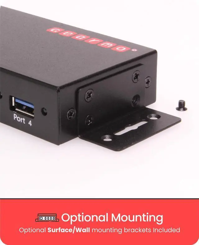 The GM-HU34PWL Gearmo USB 3.0 4 port hub is an industrial metal hub that is meant for surface mounting environments. All downstream ports are located on the front panel while the Type-B upstream port is located on the back panel along with the Terminal power connection. The GM-HU34PWL USB 3.0 hub includes mounting bracket & screws for surface mounting applications. Compliant with USB 3.0 standards data speeds up to 5Gbps can be achieved and is backward compatible with USB 2.0 and 1.1.