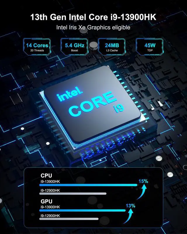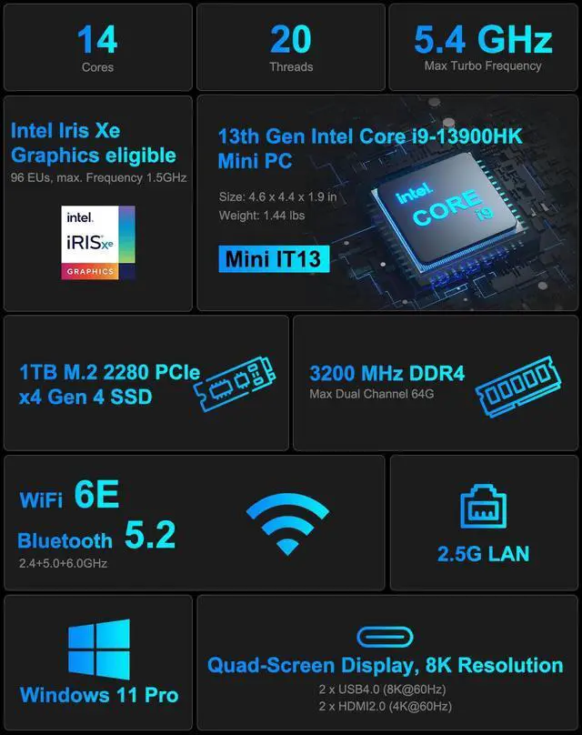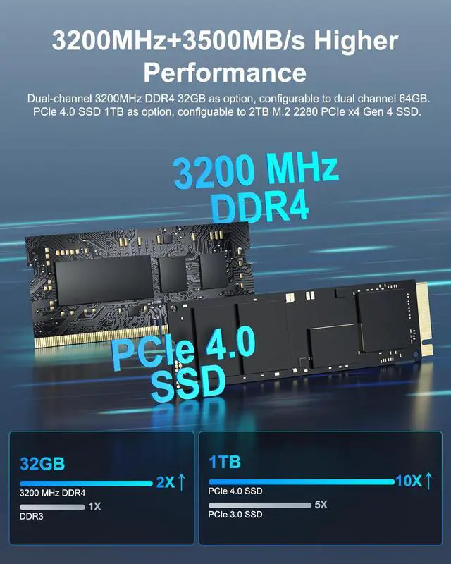 [Expandable Storage] The i9 mini pc is equipped with a 3200MHz RAM, which is 20% faster than 2666MHz RAM and supports Dual-channels, expandable up to 64GB(32+32), and offer 1TB PCIe Gen4 SSD(faster than Gen3 40%). Additionally, it extra has 1 x M. 2 2242 SATA SSD slot, expandable up to 1TB; 1 x M. 2 2280 PCIe Gen 4*4 SSD supporting up to 2TB capacity; 1 x 2.5 "SATA HDD (7mm) slots, expandable up to 2TB. GEEKOM IT13-large memory enables seamless multitasking, sures smooth and efficient performance without any lag!