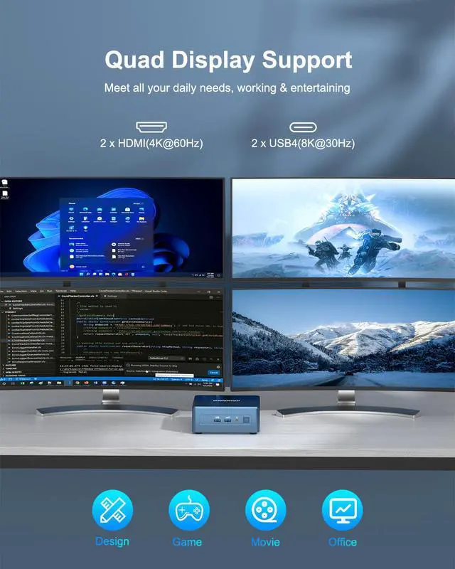 [8K UHD & 4 Screens Support] Equipped with Intel Iris Xe Graphics and have 2 x USB 4.0 ports(Support DP 1.4, 8K@30Hz), 2 x HDMI 2.0 ports(4k@60Hz), Support two 8K displays and two 4K displays (four monitors in total) at the same time to do multitask, play games, and enjoy more sharp, lifelike visuals. All ports are aligned in a single row for easy access, reducing cable clutter and making connectivity more efficient and hassle-free.