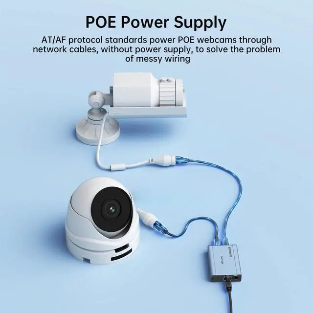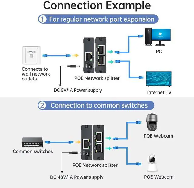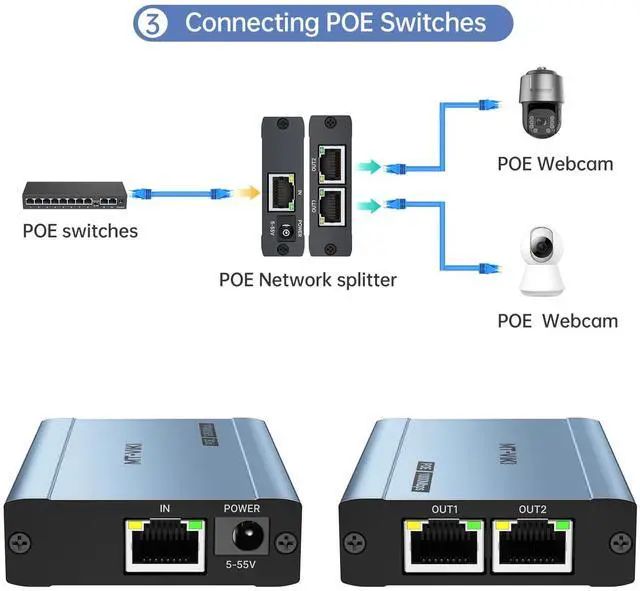 This POE Gigabit Ethernet Splitter 1 to 2 allows you to run Ethernet cables from a PoE Switch over long distances, and then split the PoE signal into the POE IP Webcam/IP Speaker/IP Phone and other POE Devices at high speeds of up to 1000 Mbps, NO Power Supply Required.