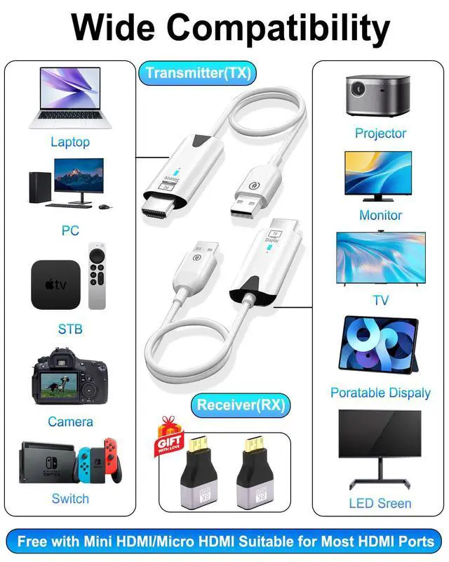 • 2026 Upgraded Built-in LDS Antenna Ultra Speed Transmission & 328ft/100m Range & 5G/2.4G Dual-Band Stability Experience a transmission range of up to 328ft (100m) with our wireless HDMI transmitter and receiver, offering flexible placement and convenient use. The wireless HDMI display dongle adapter features an advanced dual-band chip (5G + 2.4G), and we Upgraded to built-in NEW integrated LDS antenna enables HD+ Ultra-speed transmission, this technology can ensure our HDMI sender and receiver wireless keep a stable connection between the transmitter and receiver.