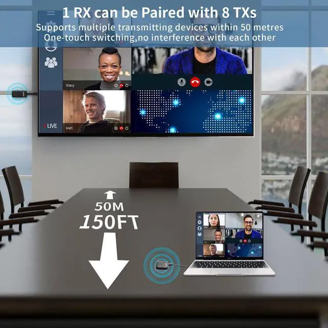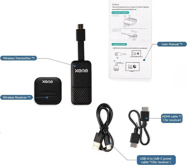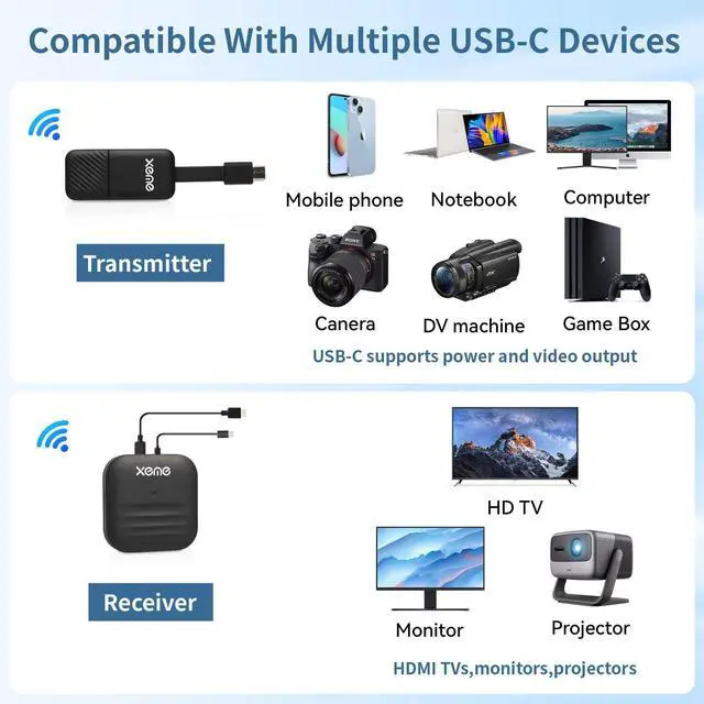 - Step 2:Plug the Transmitter to USB-C port which with power and video output to pc,/laptop,/smart phone/ etc.