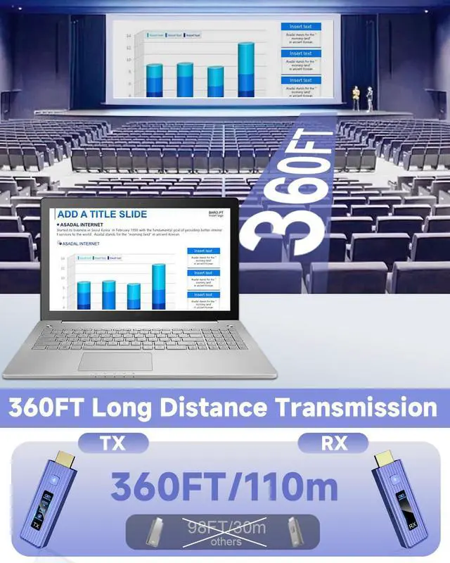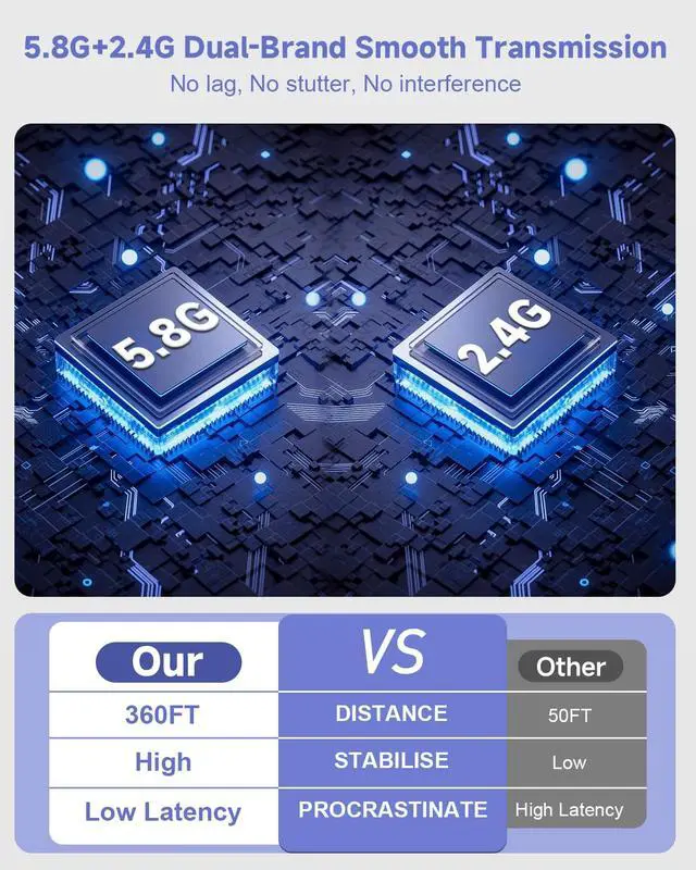 360ft Wireless Freedom Transmit video and audio wirelessly up to 360ft / 110m, perfect for living rooms, bedrooms, and home theaters. Dual-band technology ensures smooth playback with minimal interference.