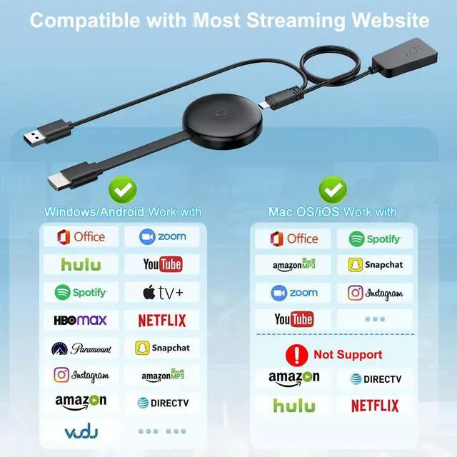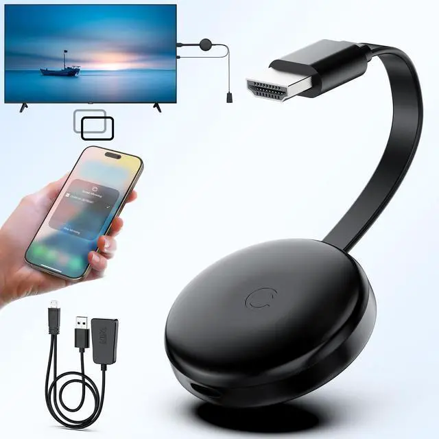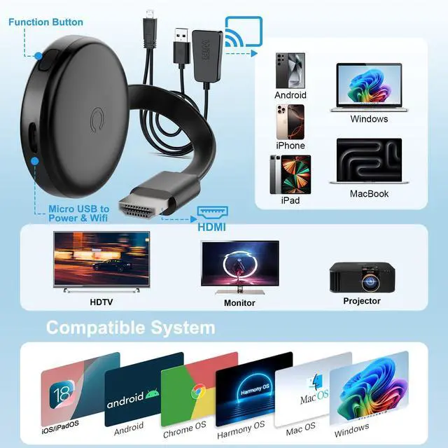 Immersive 1080P HD QualityWireless display adapter has a built-in high-performance chip that ensures precise signal transmission and vivid colour reproduction. Enjoy immersive visuals with up to 1080P picture quality. The wireless HDMI adapter allows you to share your favourite movies, videos, presentations, photos, games and online content from the small screen (iPhone, iPad, Ma,cbook, Android smartphones, tablets, laptops) to the big screen devices (TV/monitor/projector).