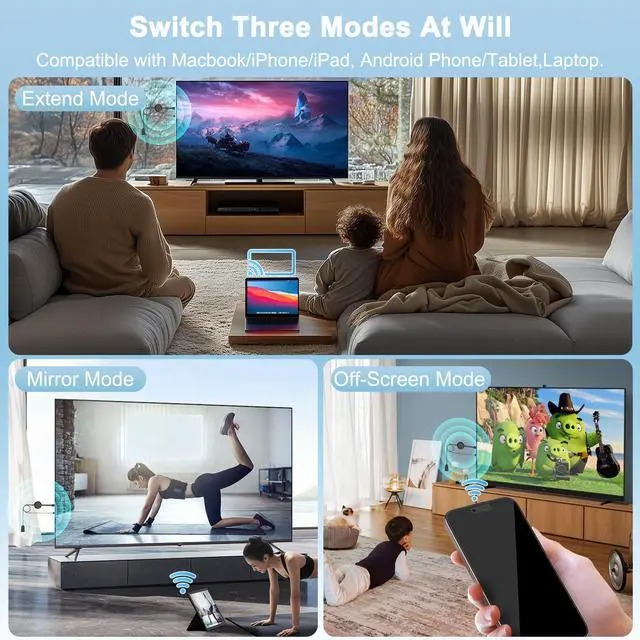 Screen Mirroring and ExtendedWith Mirroring Mode, simply connect the wireless monitor adapter to your TV, power it on, and enable the Mirroring function on your device to start projecting. Enjoy smooth HD video and audio from your device on any TV. In Extended Mode, the WiFi display dongle turns your TV into a second screen, allowing you to multitask on your device while presenting or watching content. Perfect for presentations, streaming shows, or working while browsing.