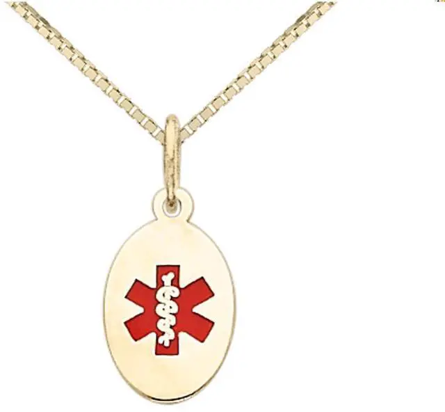 Feel secure without cramping your style with this medical charm pendant, crafted in glowing 14 karat yellow gold. Featuring a sleek oval charm with an enamelled medical emergency symbol, and complete with matching chain, this will make a thoughtful gift for yourself or someone you love this holiday season.