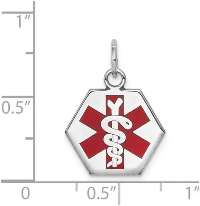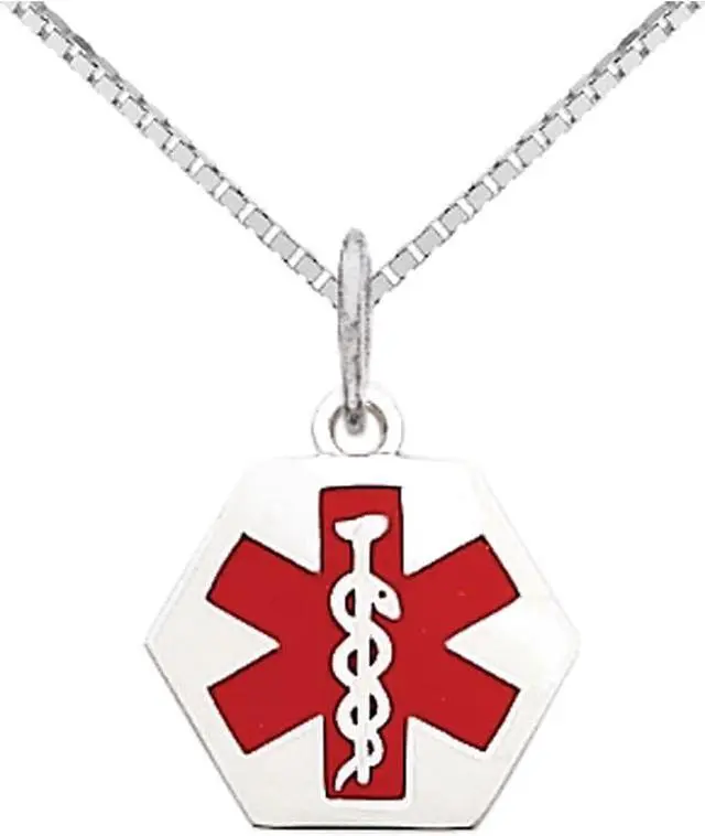 Feel secure without cramping your style with this medical charm pendant, crafted in glowing 14 karat white gold. Featuring a hexagonal charm with an enamelled medical emergency symbol, and complete with matching chain, this will make a thoughtful gift for yourself or someone you love this holiday season.