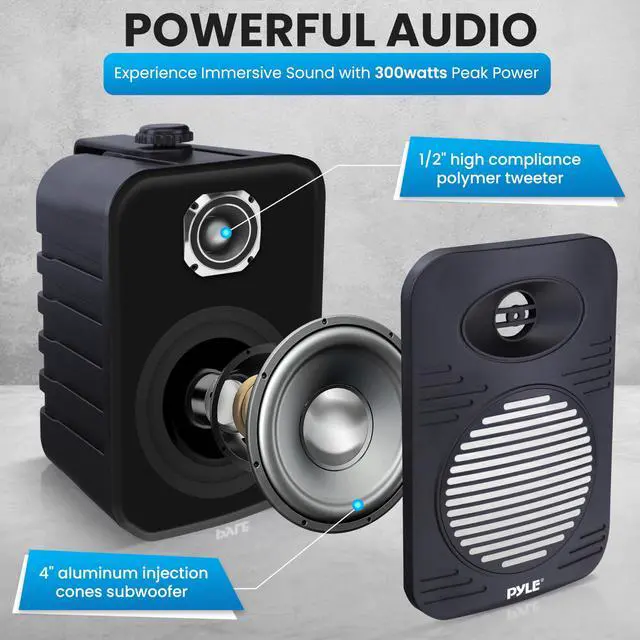 Indoor Outdoor Speakers Pair - 300 Watt Dual Waterproof 4 2-Way Full Range Speaker System w/ 1/2 High Compliance Polymer Tweeter - in-Home, Boat, Marine, Deck, Patio, Poolside (Black)