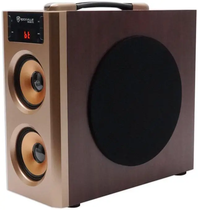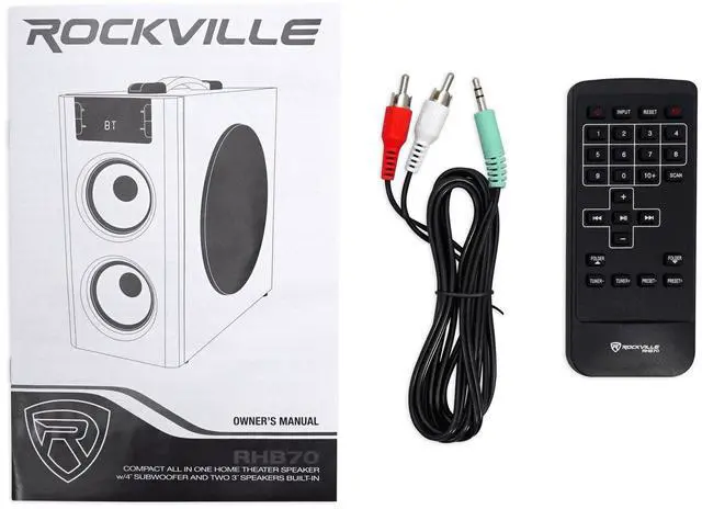 - Rockville RHB70 Compact all in one home theater speaker with 4” subwoofer and (2) 3” speakers built in