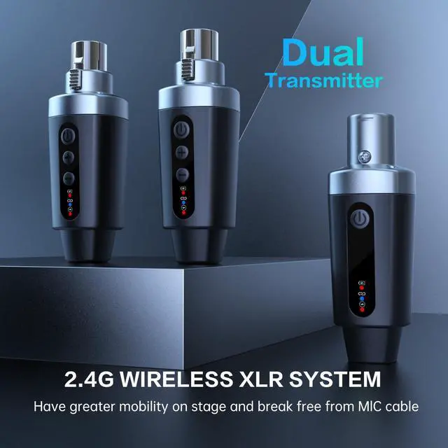This 2.4G XLR microphone wireless system brings freedom to your favorite XLR dynamic mic. Movement isunrestricted, with no cables to trip over and get in the way. The quick and simple setting makes it easy foreveryone to enjoy wireless microphone sound.