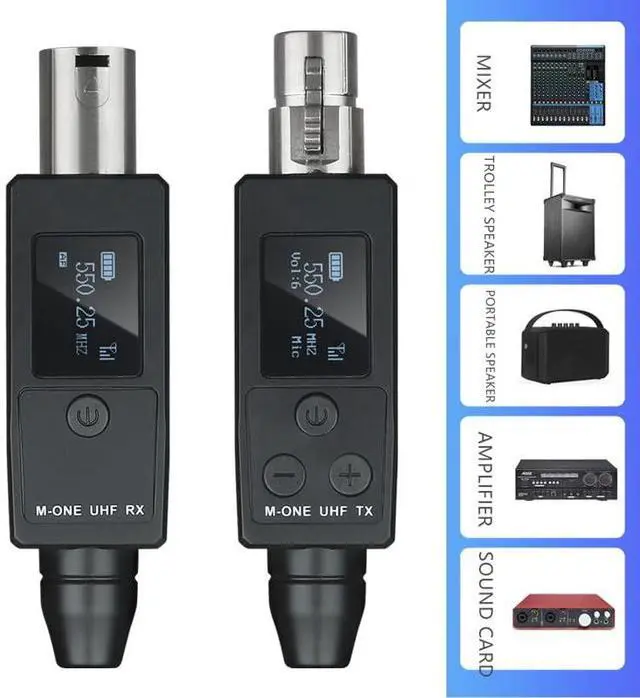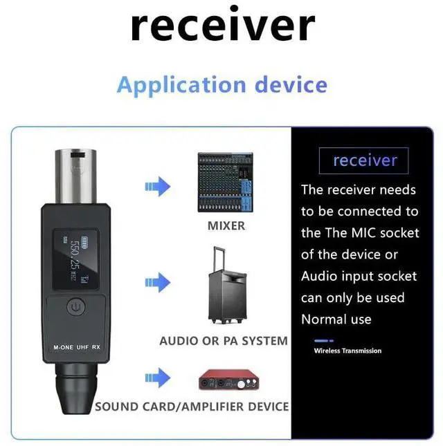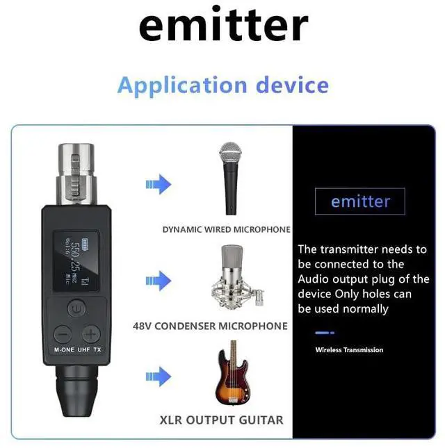 Dynamic- XLR transmitter and XLR receiver : Works with any dynamic/Harmonic microphone or battery-powered condenser wireless microphones system, Audio mixer, PA system, Provides stable and reliable wireless transmission.