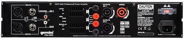The Gemini XGA-5000 is a two-space, high output power amp that offers clean, reliable power in a durable, lightweight enclosure. With 5000 watts of Instant Peak Power (1100 watts RMS), the XGA-5000 is ideal for powering PA systems and DJ rigs. To ensure seamless, reliable performance, the amp features front-to-rear airflow and a variable-speed cooling fan for thermal stability, DC output protection and short circuit protection. The XGA-5000 boasts XLR and ¼-inch balanced inputs and three Speakon outputs, one for bridged mono operation and thye other two for stereo operation.