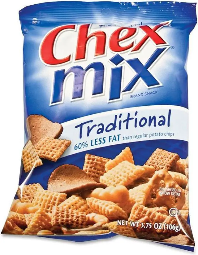 Chex Mix comes in single-serving snack bags with less fat than regular potato chips. Great for breakrooms or travel. Each easy-to-carry bag packs an appealing mixture of corn Chex, wheat Chex, pretzels, bagel chips and mini breadstick bites covered lightly in a zesty flavoring. Each bag contains 3.75 oz.