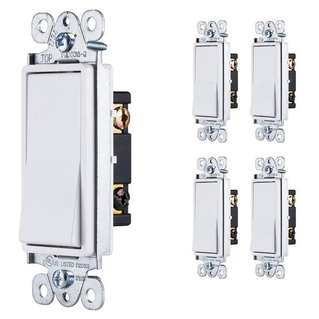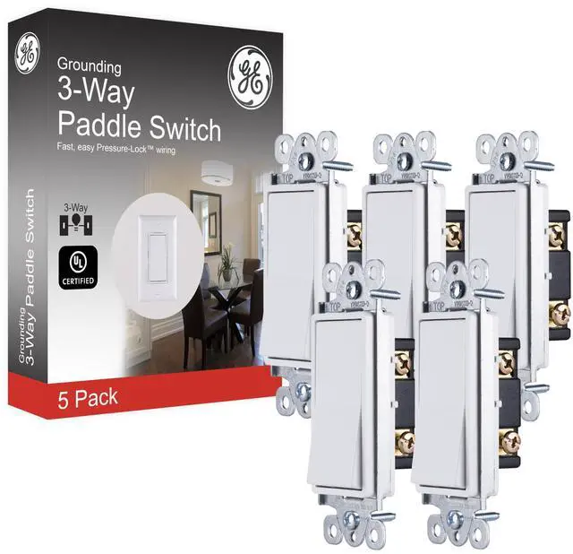 Enhance your homes outlets with a set of five GE-branded UltraPro Grounding Three-Way Paddle Switches. Featuring a rocker-style switch and a maximum electrical rating of up to 15A, this three-way paddle switch supports general household uses without concern about overload. In addition to providing a reliable grounded rocker paddle, the bright white finish easily integrates with your buildings existing outlets. The attractive designer shape of this unit provides a sophisticated alternative to the traditional switch, adding a decorative touch to your interior design. Quickly and confidently connect the receptacle using Pressure-Lock wiring. Traditional screw terminals are also available to accommodate every installation method, making it the perfect replacement for any existing switch in your home. Whether youre a general contractor or a DIYer, this unit will make upgrading your bedroom, kitchen, office, workshop or other space a breeze. This UL listed unit is for use with three-way operations with two switches controlling one fixture from multiple locations. Take control of your electrical system with a GE-branded UltraPro Grounding Three-Way Paddle Switch.