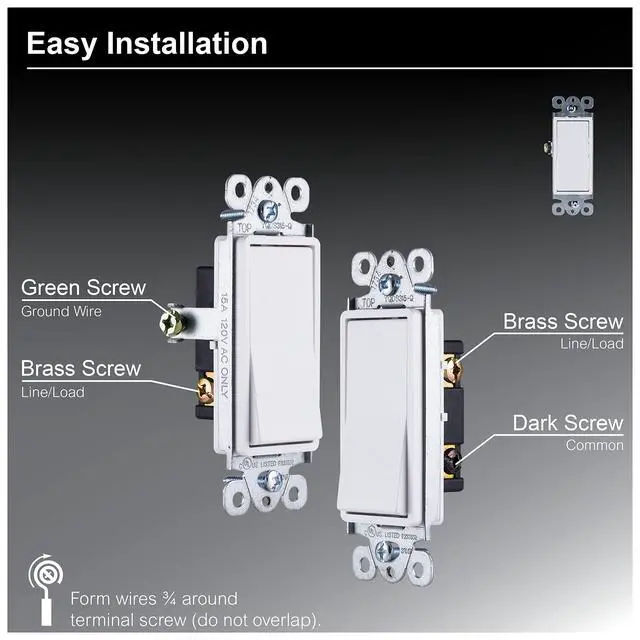 The Designer 3-Way Switch allows you to update your light switches to today's style. Features fast, easy pressure lock wiring for easy installation. Designed to complement any décor. For use with permanently installed lighting fixtures controlled by one or two switches with Complete instructions included in packaging for quick and easy, step-by-step installation.