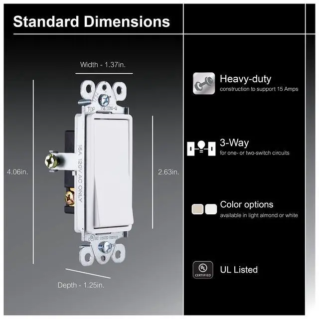 • Power More This residential grade switch is for use with three-way switches and features a 120VAC/15A maximum electrical rating to support most household appliances.