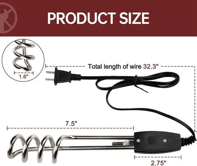 Effortlessly heat up water for your morning coffee, tea, or cooking needs with this compact and powerful 10" Steel 1000W-110V Water Heater Portable Electric Immersion Boiler Heater. Designed for convenience, this immersion heater can be easily submerged in any container filled with water, allowing you to boil or heat water quickly and efficiently. With its 1000W heating element, it can rapidly bring water to a rolling boil, making it perfect for various household tasks such as preparing hot beverages, cooking pasta, or even canning. Despite its compact size, this heater is constructed with durable stainless steel, ensuring long-lasting performance. The 110V voltage makes it suitable for standard household outlets in the United States. Lightweight and portable, you can easily move it from one location to another, making it an ideal choice for camping trips, RVs, or any situation where you need hot water on the go. With its simple operation and efficient heating capabilities, this immersion boiler heater is a must-have for any modern kitchen or outdoor adventure.Attention: As it is a heating electrical device, please pay attention to safety and do not leave your line of sight when using it.