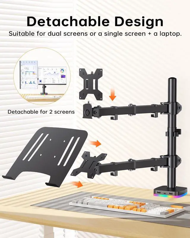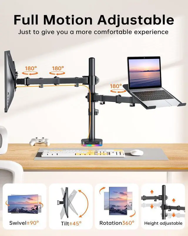RGB Monitor and Laptop Mount Stand with 3 USB Ports, Charging and USB Data Transfer, Adjustable laptop stand for 13" to 32" Screen and 11"-17 Laptop, Holds 18lbs/Arm, 75x75/100x100 VESA, C-Clamp