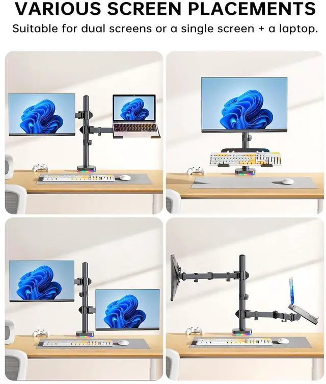 Full Motion & Ergonomic DesignThe monitor arms extend, retract and easily adjustable on a 15.7 height pole, +/-15° tilt, +/-90° swivel and 360° rotate to adjust viewing angles. It's ideally suited for programming, design, and multitasking etc.. This increases productivity and reduces the need to switch between different applications. Correct posture prevents neck and eye strain.