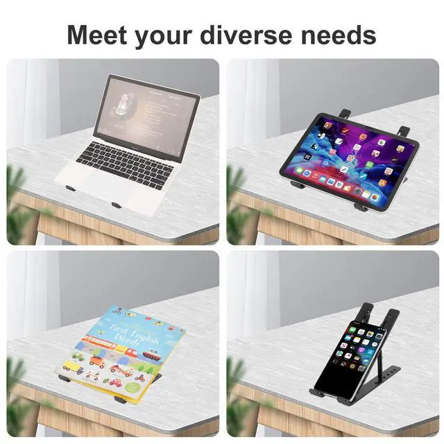 COMPATIBILITY: The laptop & tablet stand supports most devices from 10 - 15.6 inches: MacbookiPad Pro, etc. DESIGN: The laptop holder elevates your notebook from 2.1 to 5.7 height for a perfect eye level, letting you fix posture and reduce your neck fatigue, back pain and eye strain.ergonomic design makes for easy watching and typing, relieving neck, shoulder and spinal pain. PORTABLE: Creative portable foldable design, this portable laptop stand weighs 0.52 pounds and can be quickly folded into a small size of the student's ruler and with the portable storage bag to make it easy carry-on. WORKMANSHIP: aluminum alloy, with sand blasted and brushed processes. avoid from risking of any scratches to your devices and stable placement. Be the best version of yourself with the "WeOurWE" laptop stand.
