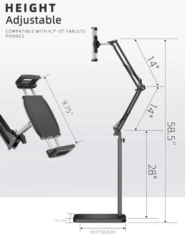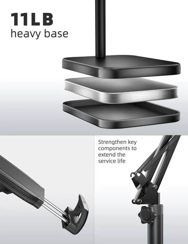 | Specifications | 15.8 L x 10 W x 3.5 H inches, 6 kilograms, BSUS-Heavy base stand, Floor Stand, Metal base,Support robs*2, Folding arm, Pull chuck, iPad 5/6/7/8/9, iPad mini 1/2/3/4/5/6, iPad Air 1/2/3/4/5, iPad Pro 9.7"/10.5"/11" 1st/11" 2nd/11" 3rd; Galaxy Tab S 8.4/S 10.5/S2 8.0/S2 9.7/S2 8.0(2016)/S2 9.7(2016)/S3/S4/S5e/S6/S6 Lite/S9; Galaxy Tab A 8.0 (2015)/A 9.7 (2015)/A 7.0(2016)/A 8.0 (2017)/A 8.0 (2018)/A 10.1 (2019)/A 8.0 (2019)/A 8.0 (2019)kids//A Kids(2019)/A 8.4(2020)/A7 10.4(2020)/A9; Galaxy Tab 7.0/7.0 Plus/7.7/8.9/2 7.0/3 7.0/3 8.0/3 Lite 7.0/4 7.0/4 8.0/4 10.1; Galaxy Tab Pro 8.4/Pro 10.1; Kindle Fire 1st, Fire 5th, Fire HD 6 4th, Fire 7 7th/9th, Kindle Fire HD 7 2nd/3rd/4th, Kindle Fire HDX 7 3th, Fire HD 8 5th/6th/7th/8th/10th, Fire HDX 8.9 3th/4th, Fire HD 10 5th/11th; Kindle 2/4/5/7/8/10//Keyboard/DX/DX Graphite/Touch/X Migu/Voyage/Kindle 2022, Kindle Paperwhite 1/2/3/4/5,Kindle Oasis/Oasis 2/Oasis 3;Pixel C; Switch(Without joy cons); Other devices, Black, , Comply with Amazon item return policy, true, When standing, sitting, or lying down: Playing music Watching movies Reading ebooks Playing games Taking photos Recording videos Livestreaming In bed, during bathing, cooking, treadmill training, Switch gaming, workout videos, reading, watching, video conferencing, online lessons, TikTok livestreams, or overhead camera recordings: Playing music |