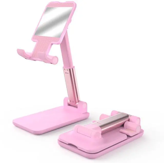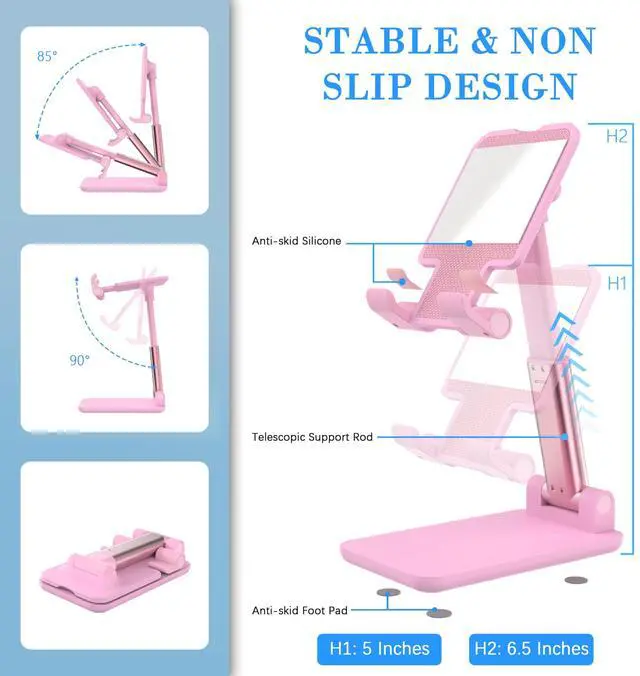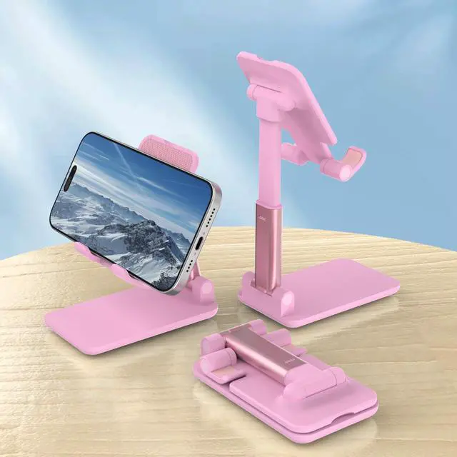Cell Phone Stand, Adjustable Angle and Height Cell Phone Holder for Desk, Foldable and Portable, Anti-Slip Silicone Pad, Compatible with All Mobile Phones and 4-8 Inch Devices, Pink