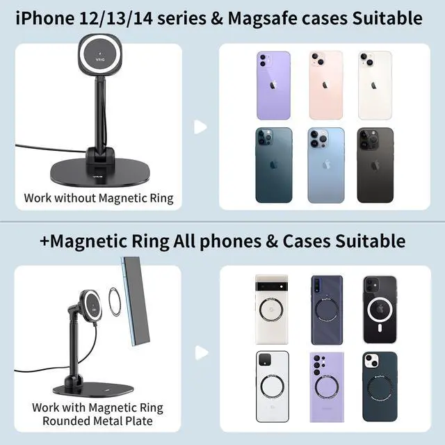 With Magnetic Ring & Designed for iPhone and Android PhoneThe magnetic desk phone stand is specially designed for iPhone and Android Phone. With Magnetic Ring,it suitable for iPhone and Android, such as iPhone 16/15/14/13/12 Pro Max/Samsung Galaxy S10/S9/S8 Plus, and most other smartphones