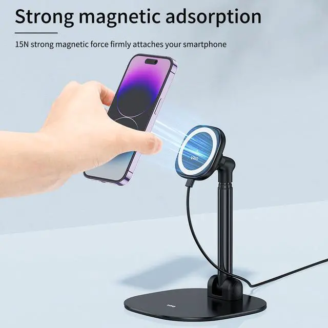 Rechargeable & Strong Magnetic Phone StandVRIG Magnetic Phone Stand built-in strong magnet, which can firmly hold the iPhone 16/15/14/13/12 series or MagSafe cases. Strong magnets will hold your iPhone firmly without fear of falling. Our magnetic desk phone stand are more convenient than traditional brackets.With up to 15W, you can easily charge your phone by simply placing it on the stand. Faster and safer