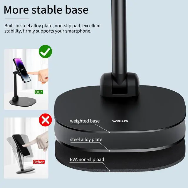 High Stability & Adjustable HeightThe magnetic desk phone stand has an adjustable height in the range of 170mm - 300mm (6.7 - 11.8 inches). Together with its adjustable tilt, it provides you with the most comfortable viewing angles and ergonomic eye-level height. It provides you with the best visual experience, while maintaining your hands free.With bigger and more stable base. And the magnet has strong suction, so it won't shake when you click