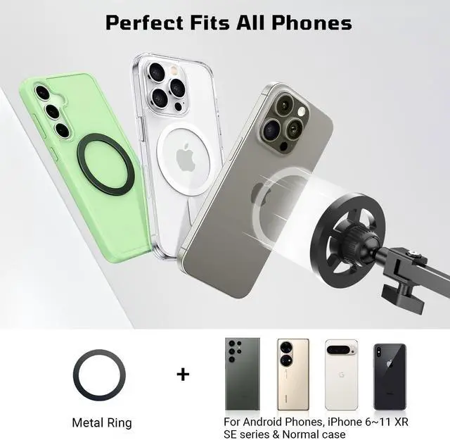 Snap on in 1s Stronger magnets instantly snap your cell phone, perfect for quick access when calls come in no more fumbling to remove your device! Effortlessly answer calls with one hand thanks to the secure yet detachable magnetic hold. Compatible with iPhone 17/16/15 etc and all, Galaxy, Pixel, no clamps needed! Includes a metal ring for non-MagSafe cases and devices like Kindle. Fits all screens and holds tight during video calls, gaming, or live streaming