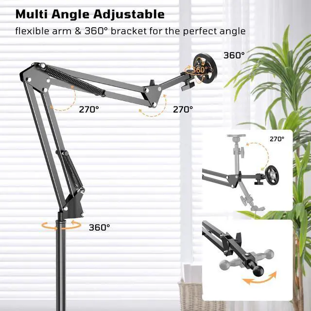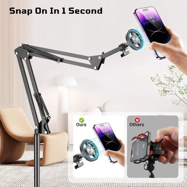 Adjustable for Any AngleThe smooth magnetic mount rotates 360 degrees, so you can tilt, pivot, or flip your phone for portrait or landscape viewing. The reinforced gooseneck arm holds firm but bends easilyperfect for bedside streaming, overhead recording, or following recipes while keeping your device rock-steady. No more drooping or shaking