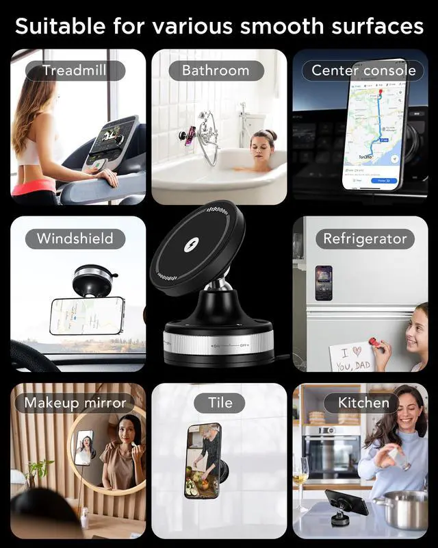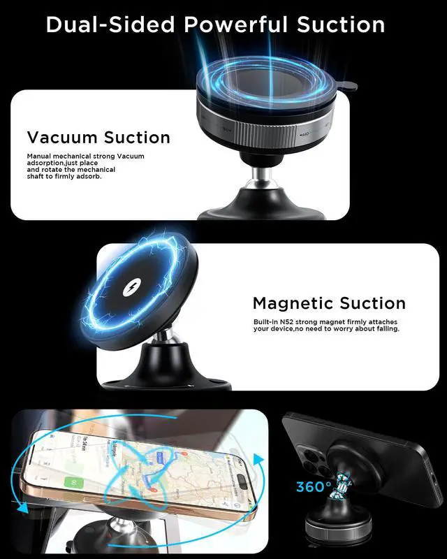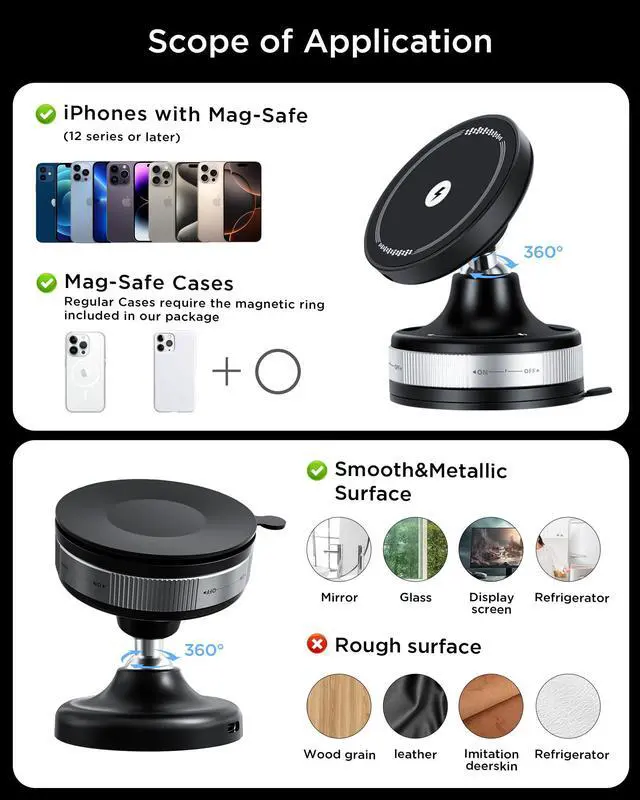 Super Strong Magnetic Force, Extreme Stability: This vacuum suction magnetic phone mount is equipped with powerful N52 magnets, this mag-safe suction phone mount provide strong magnetic attraction and precisely align with the magnets inside the phone. Allowing you to easily and safely mount your iPhone 17/16/15/14/13/12 series on the wireless car charging stand, also suitable for all other mobile phones with metal ring cases.