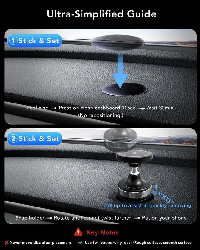 360° Rotation & Double Ball Rotatable DesignThis Magnetic Suction Phone Mount offers 360-degree adjustability with a stable double ball rotatable design, allowing the angle to be easily adjusted to suit your preferred viewing angle. The joint ball on this magnetic phone holder for car provides just the right amount of friction, allowing you to easily adjust the angle and keep it firmly in place.